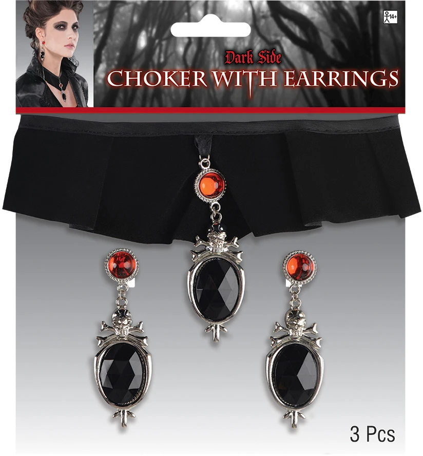 Un set de bijoux gothique avec 1 collier tour de cou ruban velours Noir à pendentif Tête de Mort Argent et Pierres Rouge et Noir, et 1 paire de boucles d’oreilles assortie, pour compléter une tenue de vampiresse ou de comtesse maléfique pour Halloween.