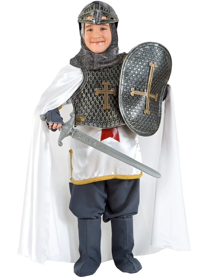 Un superbe déguisement de Chevalier Luxe pour votre petit guerrier en quête d’aventure et d’exploit, qui se compose d’un pantalon élastique, d’une paire de surbottes, d’une paire de manchettes amovibles, d’un bouclier, d’une cape en satin Blanc, d’une cagoule, d’une longue tunique en satin Blanc, avec pour accessoires un casque, un plastron et une épée.