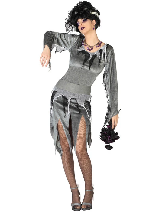 Vous lui avez juré fidélité, suivez-le dans la mort avec charme et élégance grâce à cette robe déguisement de mariée zombie Karlita très couture ! En pane de velours gris moiré très douce et brillante, sa coupe légèrement cintrée avec longueur genoux-mi cuisses mets en valeur toutes les silhouettes.