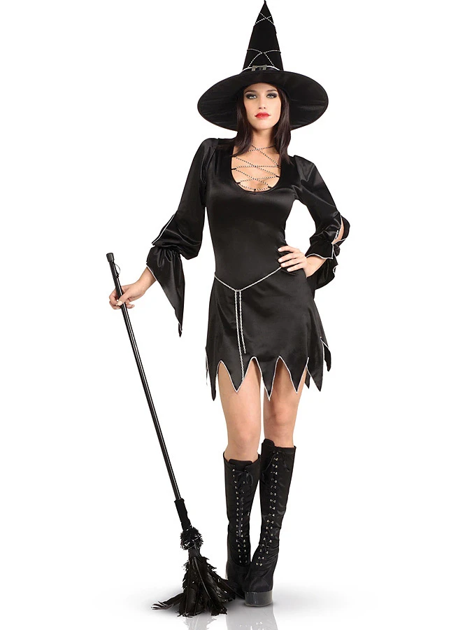 Un ravissant déguisement de sorcière avec sa robe satinée au décolleté envoûtant et son chapeau assorti, parfait pour lancer des sorts de séduction le soir d’Halloween ou au traditionnel bal des sorcières !