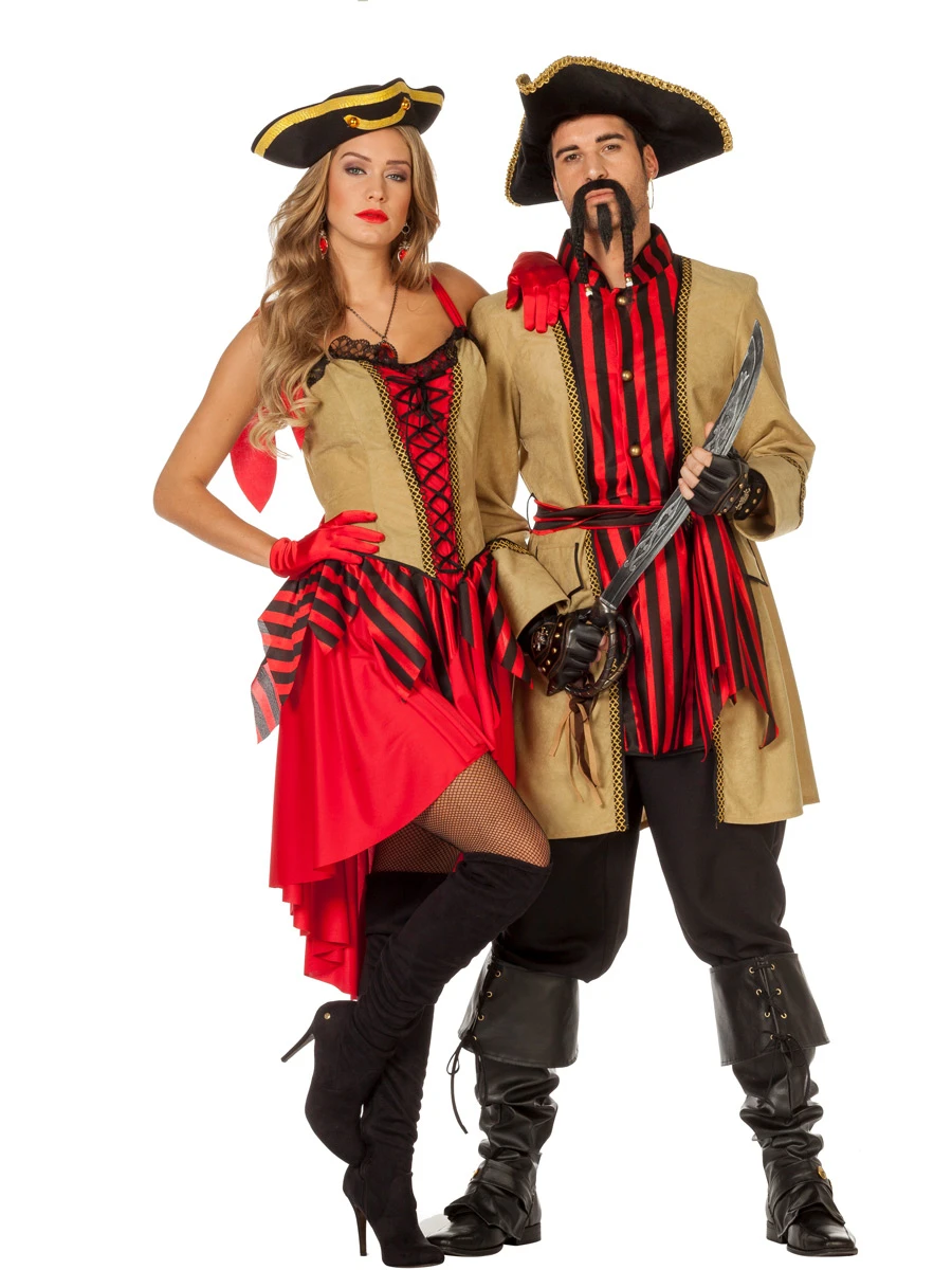 Un déguisement robe de Pirate très girly avec son bustier lacé au décolleté bordé de dentelles noires et sa jupe déstructurée, courte devant et longue derrière, sexy sans en faire trop.