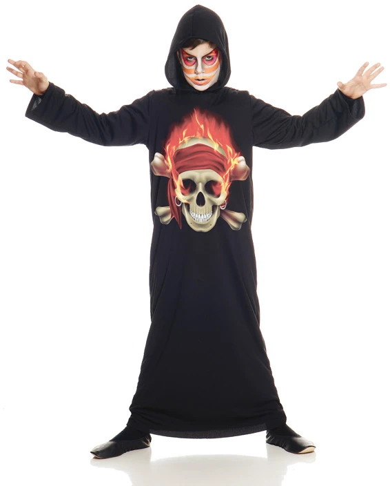 Un déguisement de spectre à tête de mort enflammée imprimée sur l’avant, à simplement enfiler sur des vêtements et des chaussures noires, et à compléter avec du maquillage ou un masque pour partir à la chasse aux bonbons le soir d’Halloween, ou pour épater les copains lors d’un goûter d’Halloween.