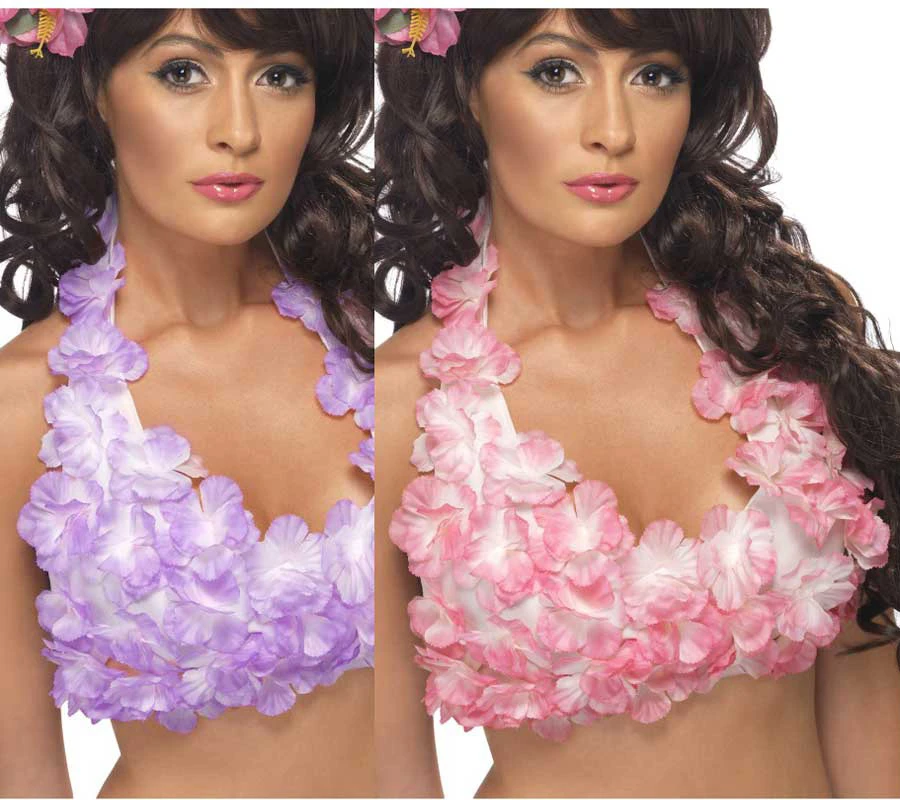 Un ravissant dos nu à fleurs hawaïennes roses ou violettes, pratique et confortable comme une brassière, pour compléter un costume de vahiné ou un déguisement Hawaï pour une beach party.