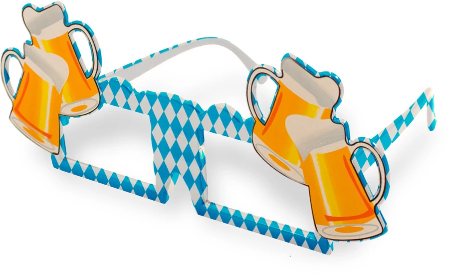 Une paire de lunettes fantaisie en plastique avec chopes de bière et petits losanges blanc et bleu, comme le drapeau de la Bavière, pour maquer le coup lors d’une soirée Oktoberfest ou un anniversaire ambiance fête de la bière.
