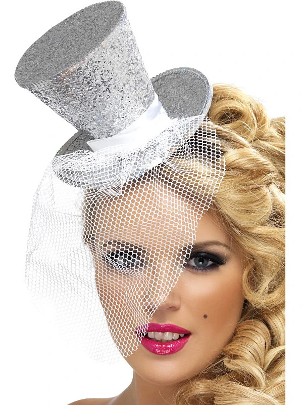 Un mini chapeau burlesque Argent brillant à voilette intégrée et détachable, pour compléter faire le show avec classe et glamour le temps d’une soirée… cabaret !